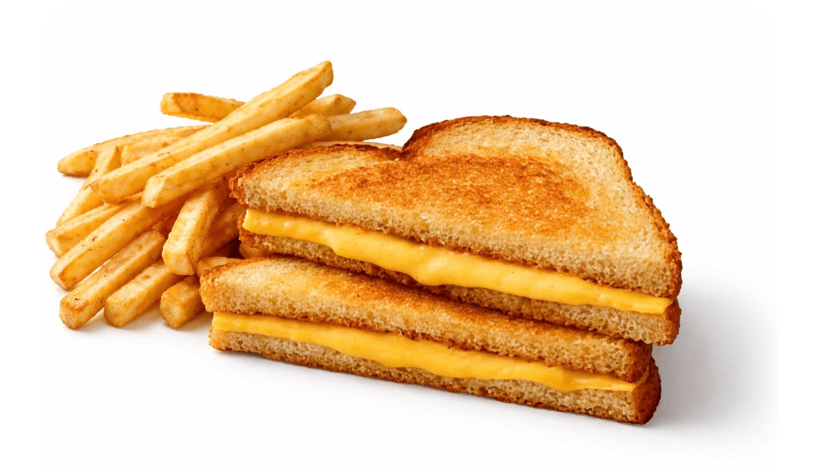Made with ooey, gooey melted American cheese on a buttered and toasted potato bread served with side of French fries