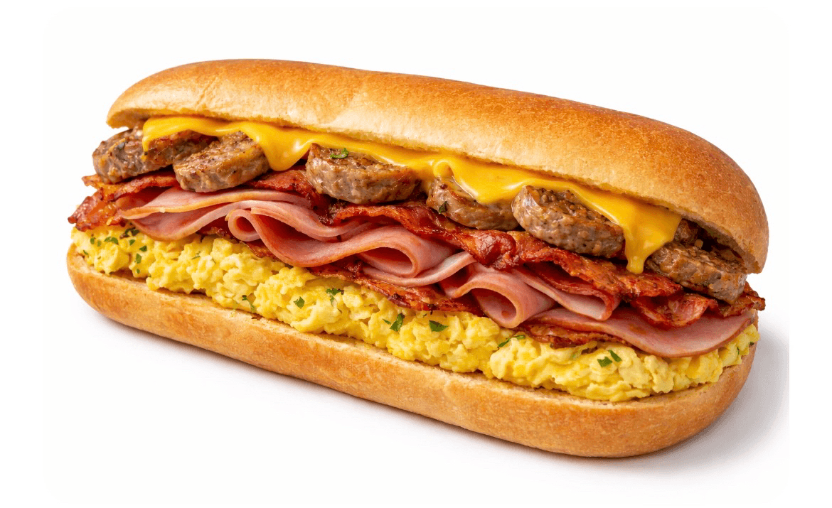 5 Fresh eggs with bacon, sausage, ham, American cheese on a hero