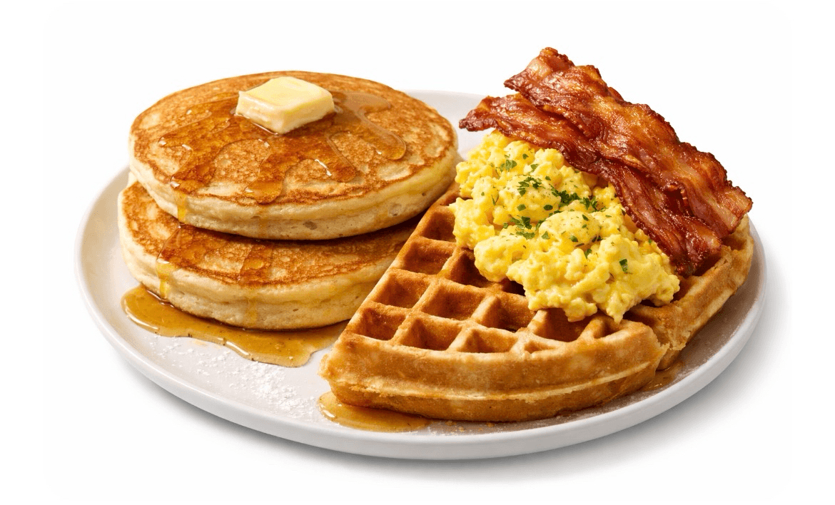 (2) pcs buttermilk pancake, (1/2) waffle served with eggs, bacon strips