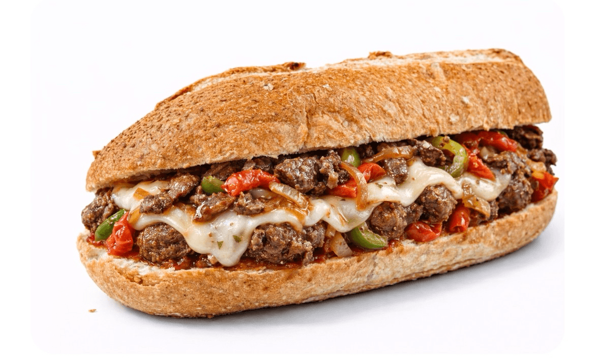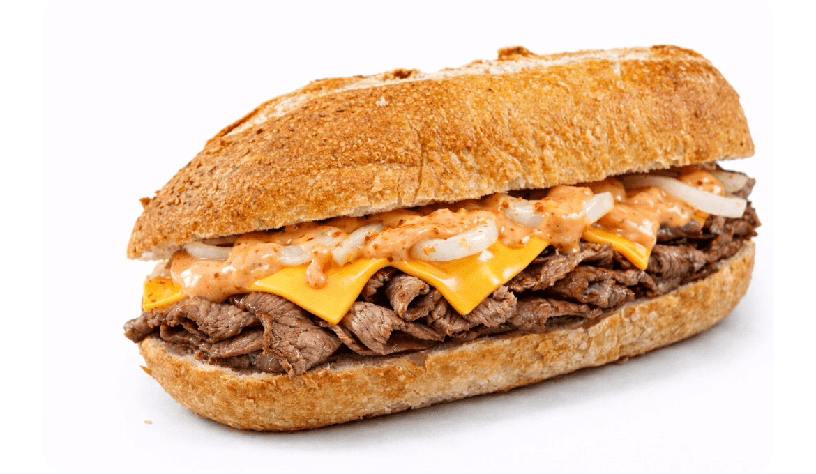 Sliced steak with peppers, onions, cheddar cheese and mayo
