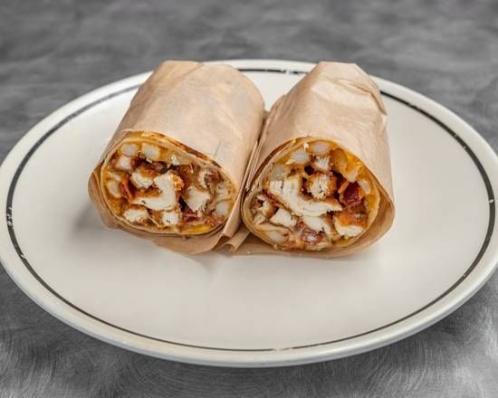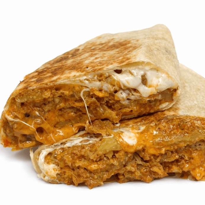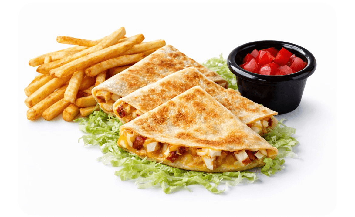 A flour tortilla filled with chicken and ooey, gooey melted cheddar cheese. Served with French fries