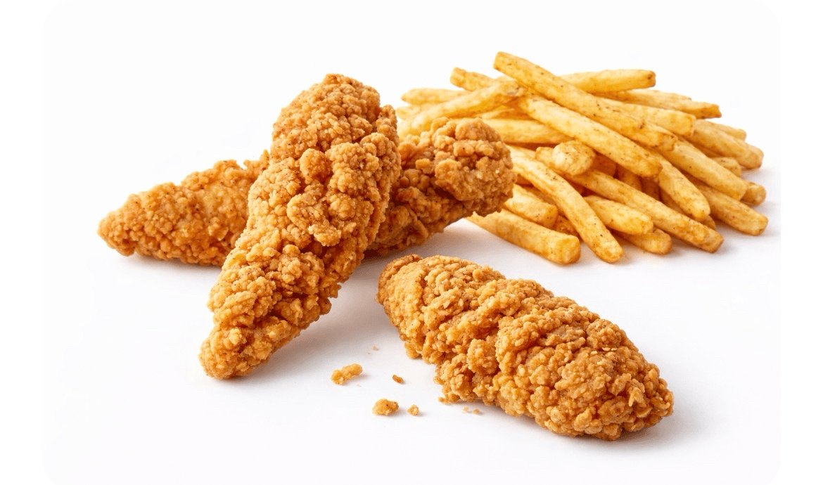 Three crispy breaded chicken tenders served with side French fries