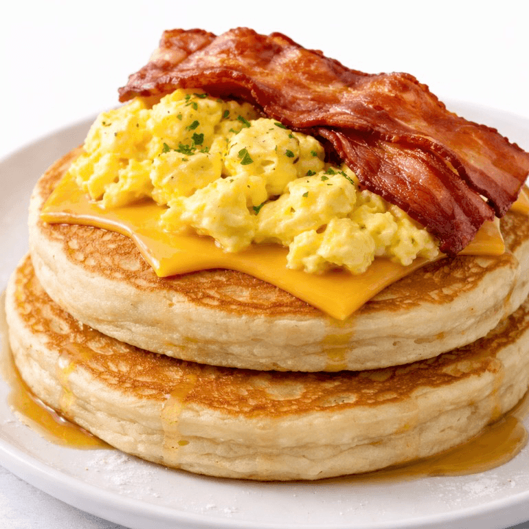 2 buttermilk pancakes, bacon, American cheese, eggs