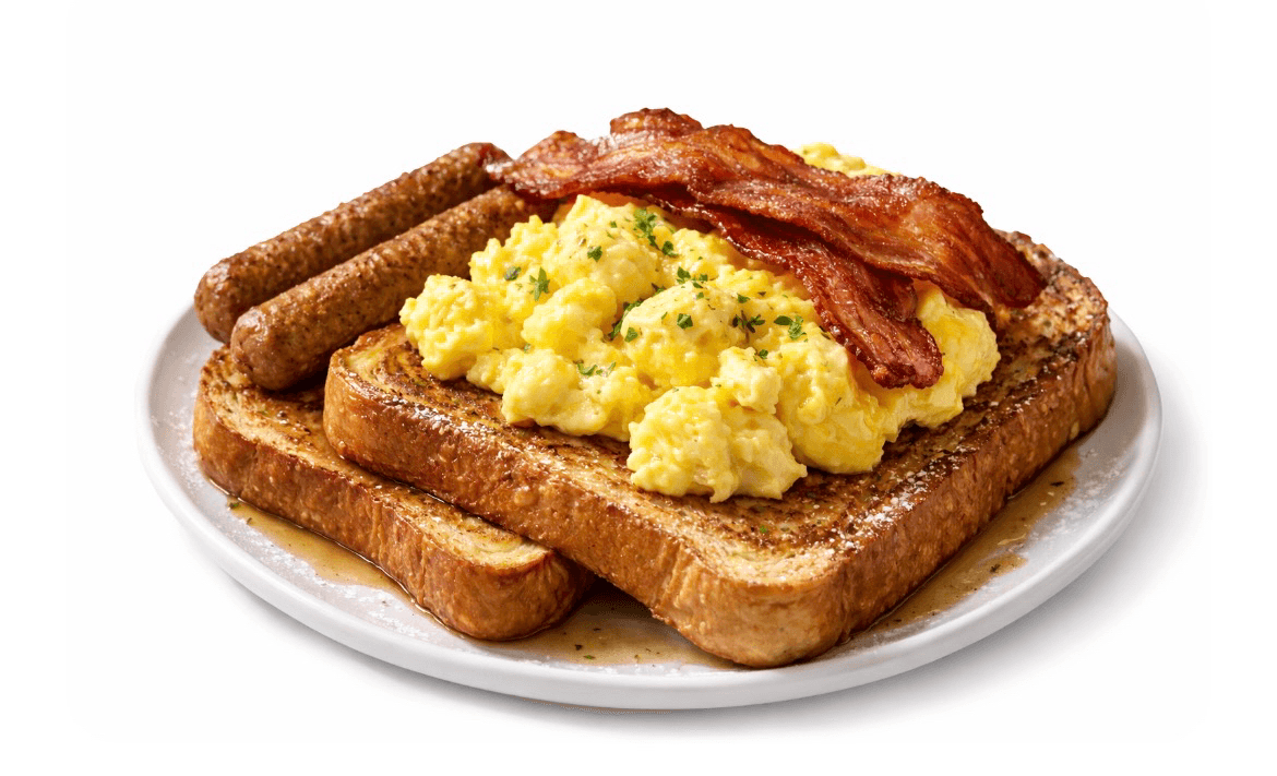 French toast served with eggs, bacon strips and sausage links