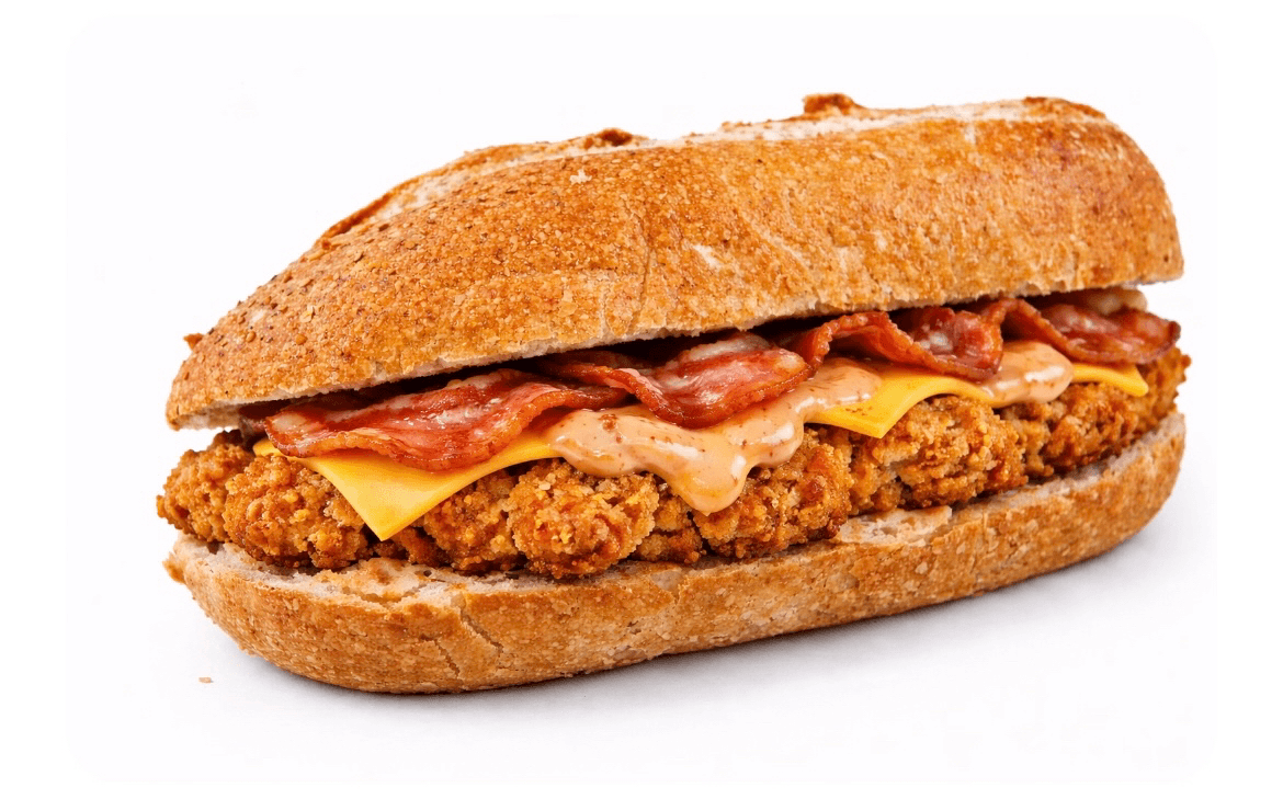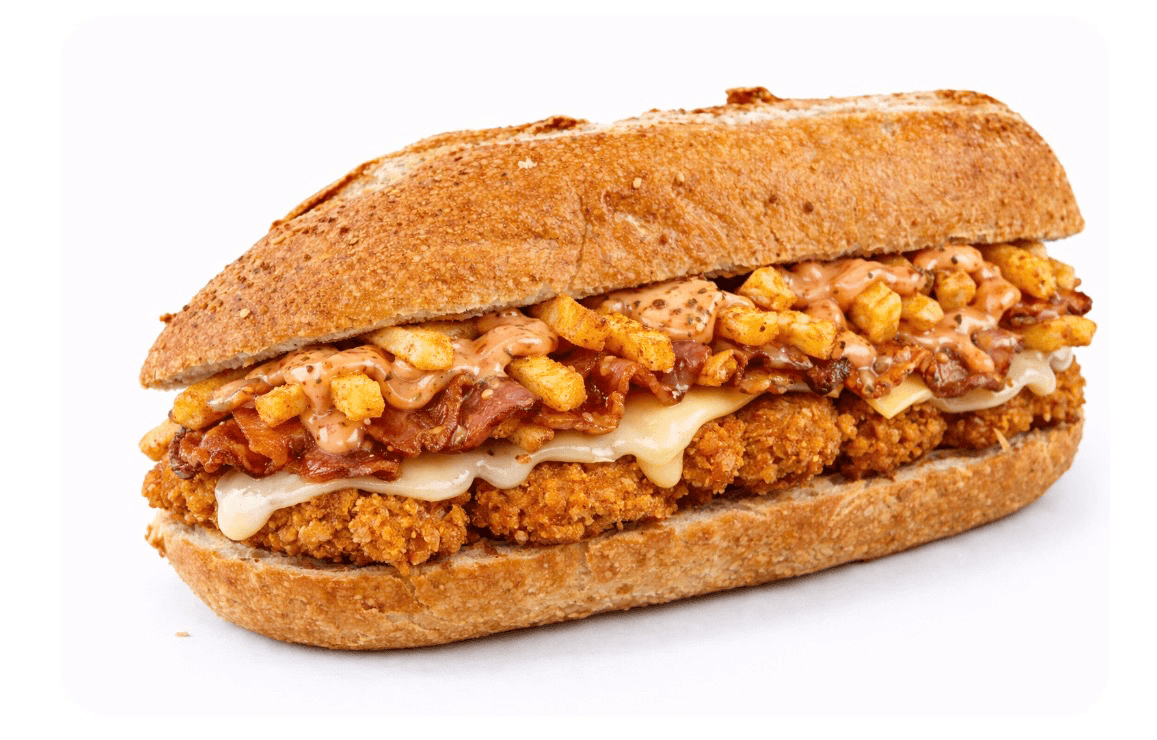 Crispy chicken cutlet, onion rings, mozzarella, bacon, spicy fries, Russian dressing