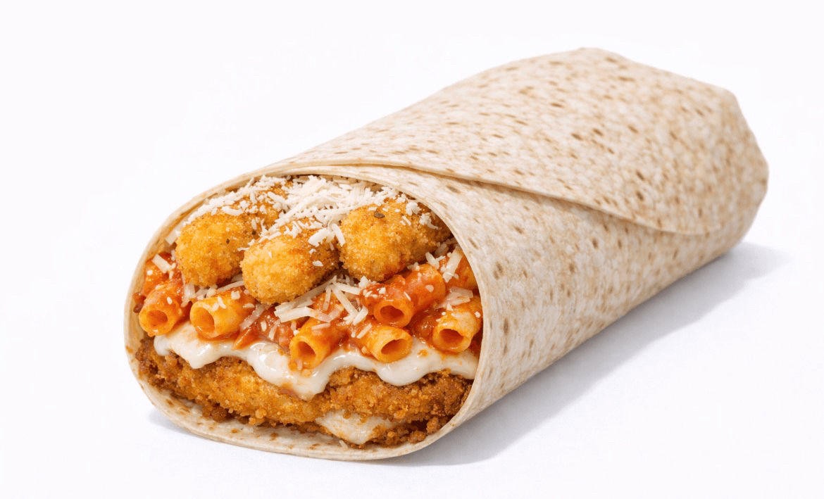 Baked ziti, chicken cutlet, and mozzarella sticks in a wrap.
