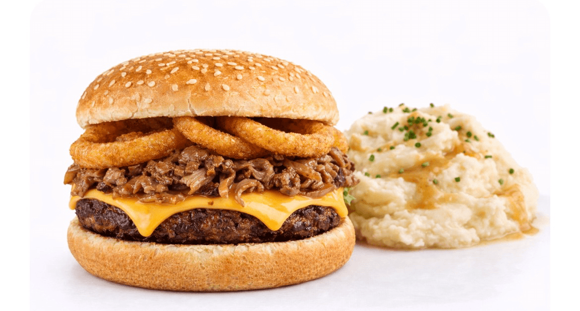 Cheeseburger topped with Philly steak, cheddar, onion rings (2), side of mashed potatoes