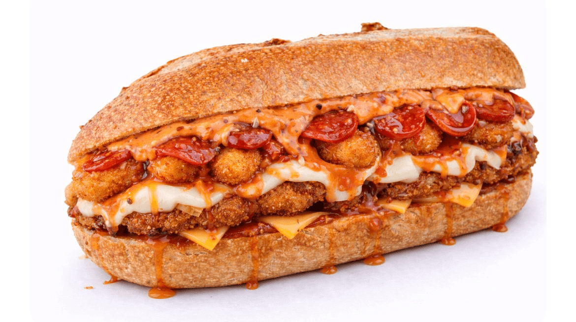 Crispy chicken cutlet, American cheese, mozzarella sticks, HOT honey, mozzarella, pepperoni, vodka sauce on a hero