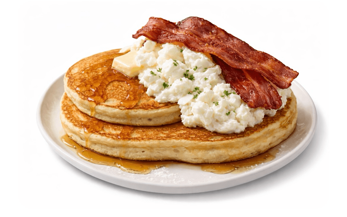 Buttermilk pancakes served with egg whites and turkey bacon