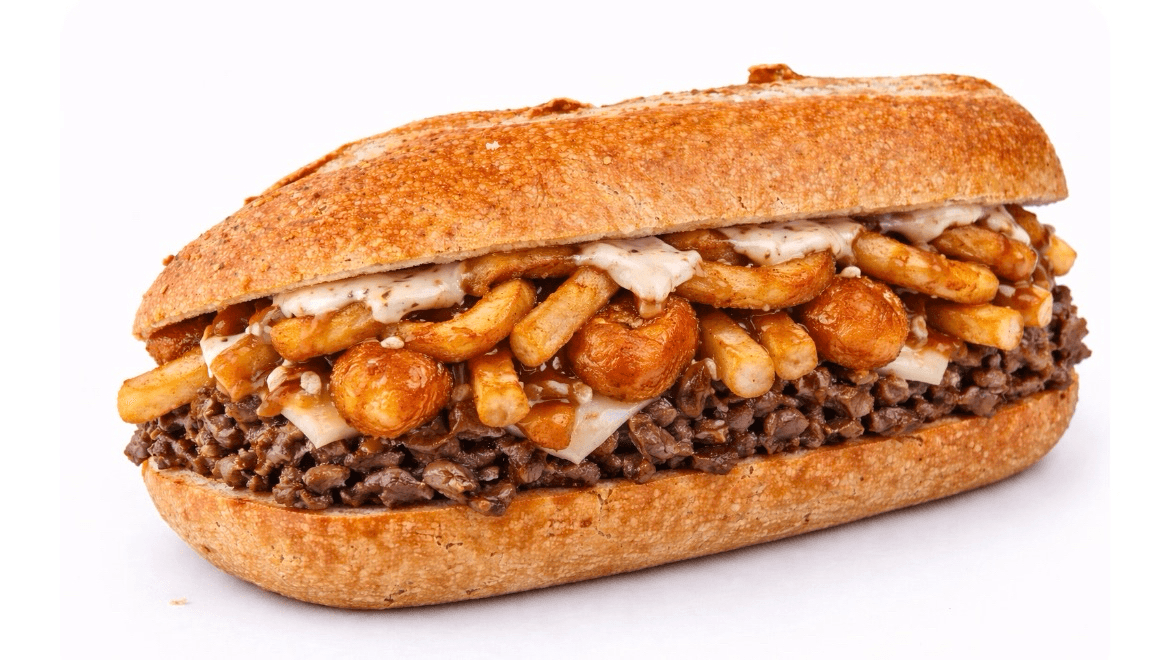 Smashed meatballs, French fries, onion rings, melted mozzarella, gravy on a garlic toasted bun.