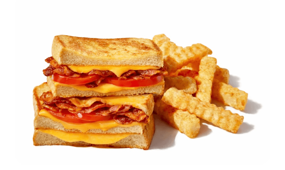 Grilled American cheese with bacon, tomato served with French fries