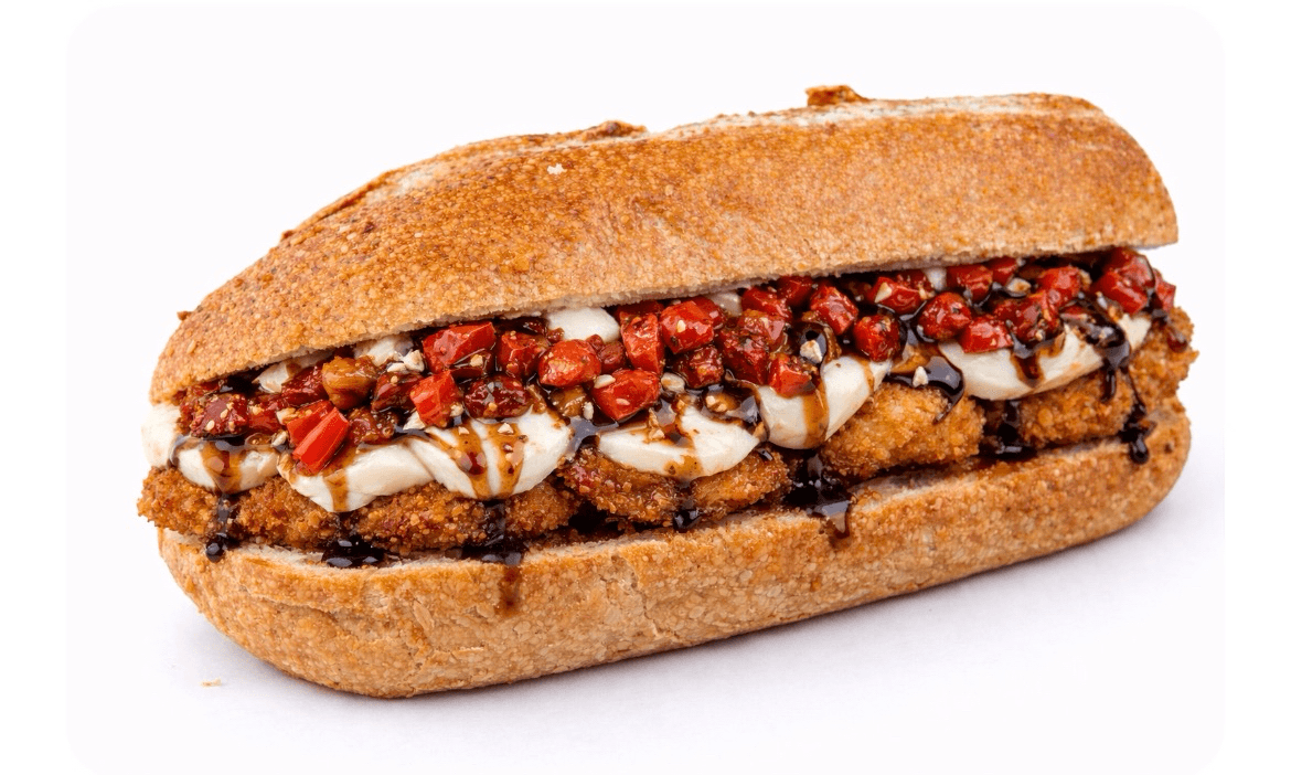 Crispy chicken, with sundried tomatoes, fresh mozzarella, roasted peppers, balsamic glaze on garlic hero