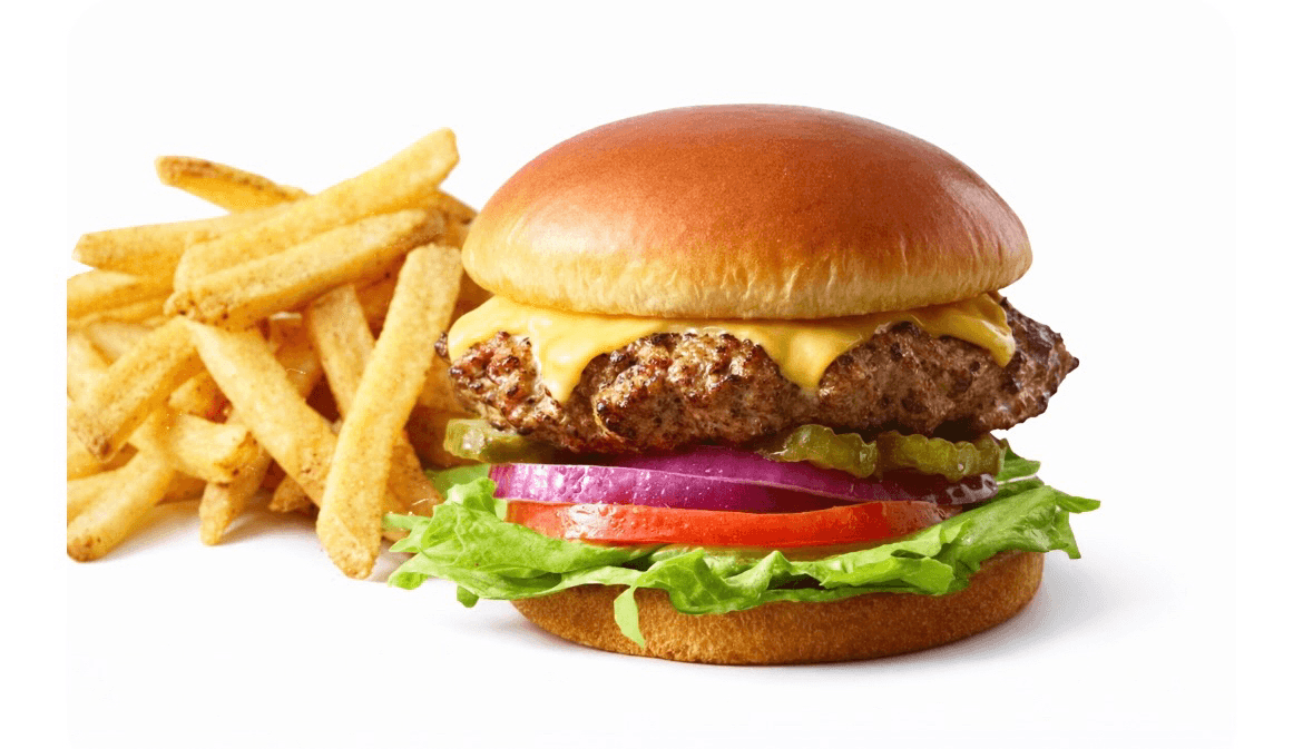 All-beef patty on toasted bun with American cheese served with side French fries