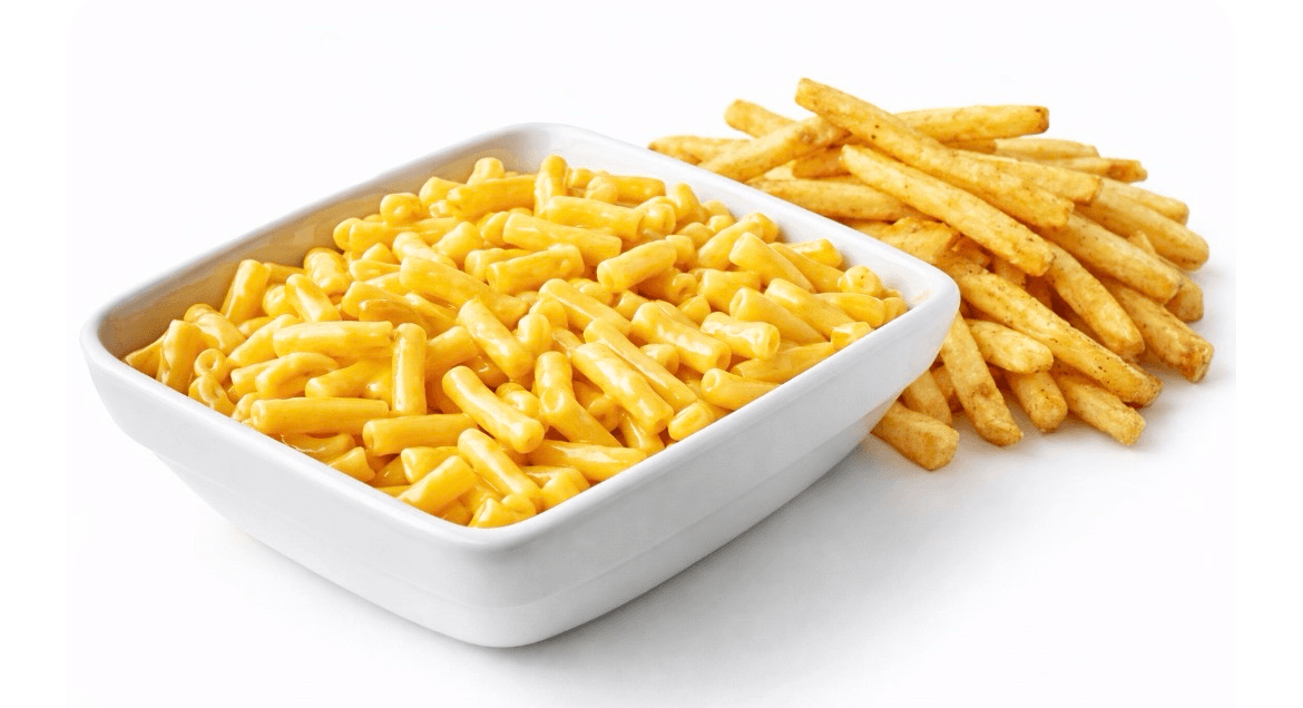 Creamy macaroni pasta in a rich cheese sauce served with French fries
