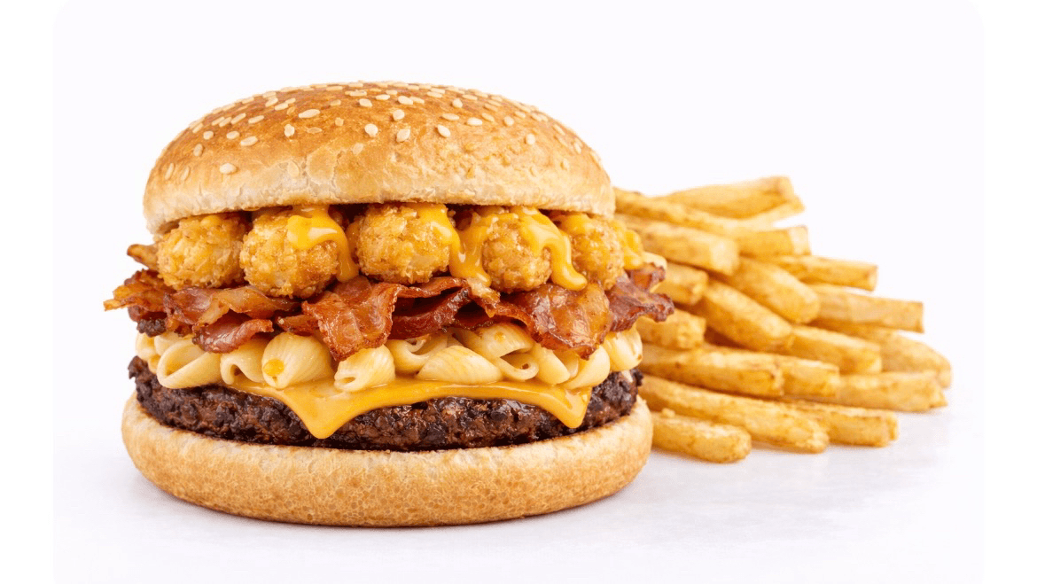 Beef patty with bacon, mac'n cheese, cheesy tater tots, side of fries