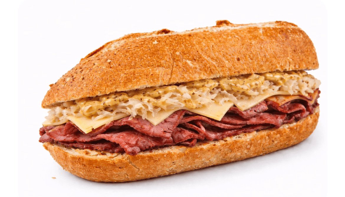 Grilled corned beef, Swiss, sauerkraut, mustard