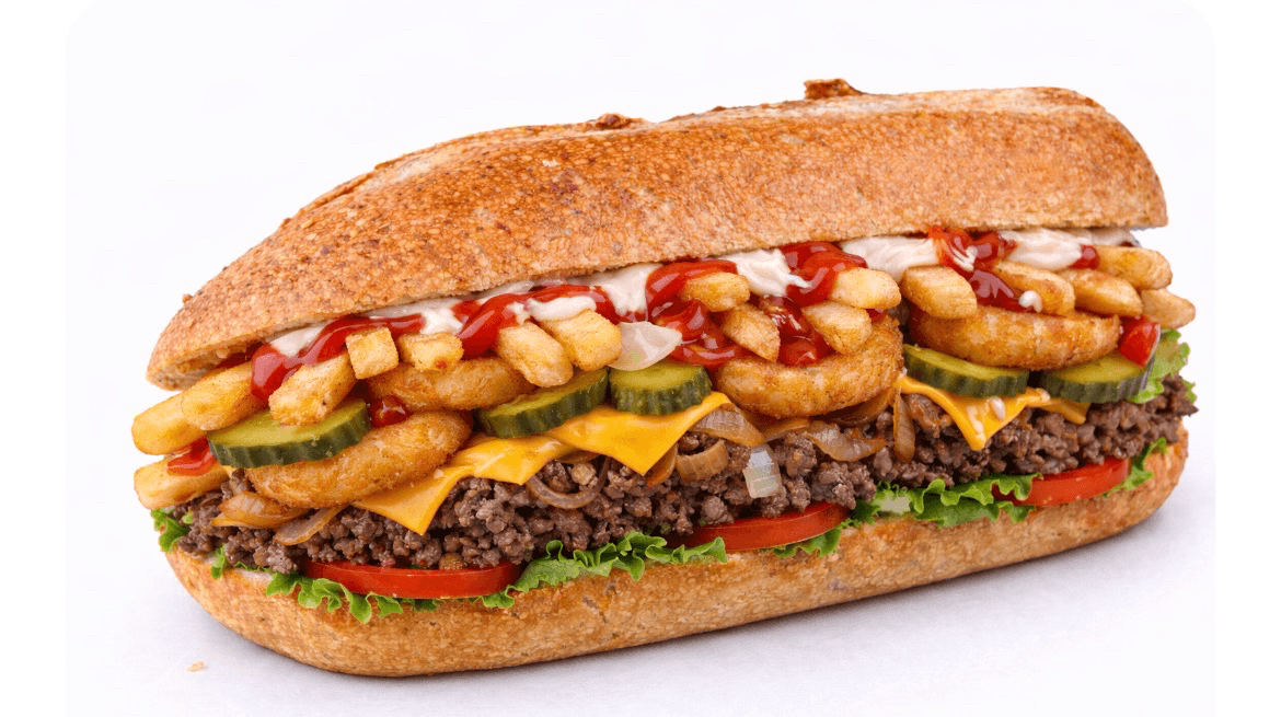 Ground beef, American cheese, sauteed onions, pickles, onion rings, lettuce, tomato, french fries, ketchup, mayo on grilled hero.