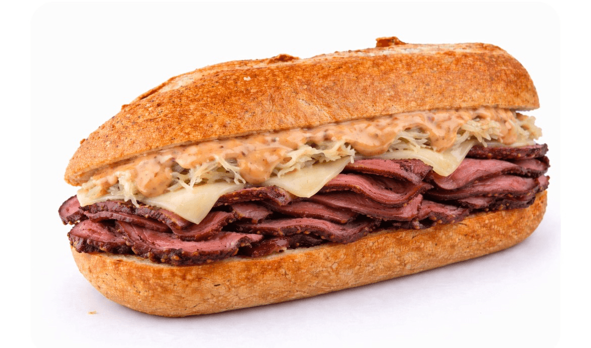 Hot pastrami, swiss cheese, sauerkraut, russian dressing on a grilled hero